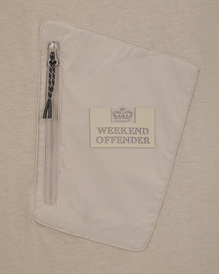 The Weekend Offender Juarez T-shirt in Bark is a stylish and practical choice for the hot days ahead. Made from knitted 100% combed Cotton fabric, it boasts a perfect balance of thick quality and lightweight feel. The 95% Nylon polyamide pocket, complete with reversed Nylon coil zip and bungee cord zip pullers, adds a touch of functionality to this otherwise fashion-forward tee. With a comfort rib neck and double layer high density WO prison print with contrast profile to sleeve, this shirt is both comfortable and eye-catching.